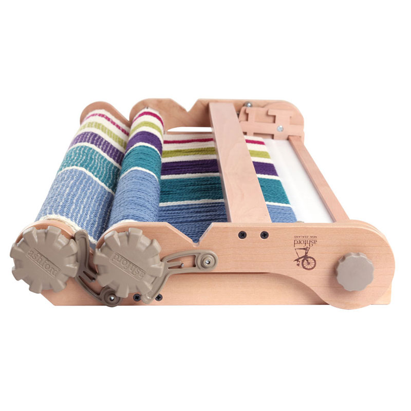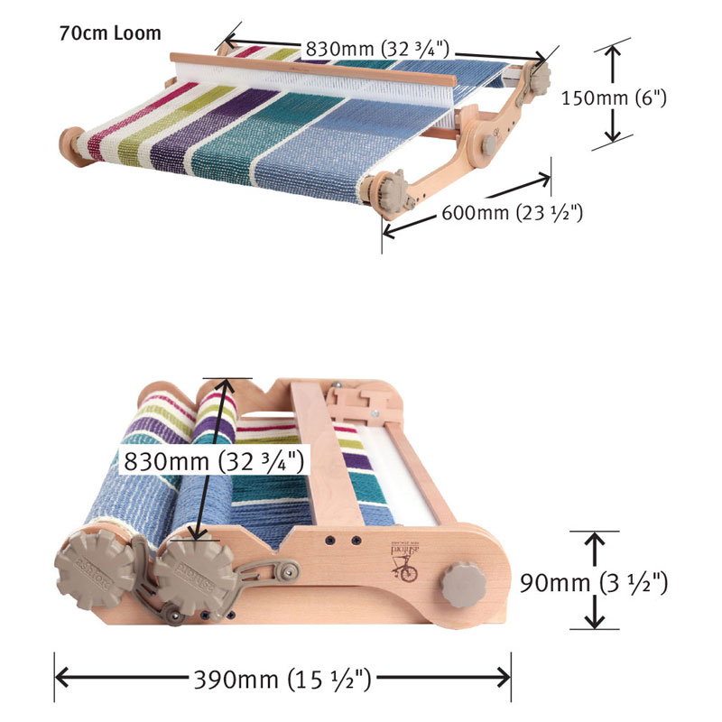 The loom is ultra portable being lightweight, compact and folds in half – even with your weaving in place. Fast - from yarn to scarf in two hours. Easy - a loom that is simple to understand and operate with nylon warp stick ties, handles, cogs and pawls. The loom is made from Silver Beech hard wood and comes assembled and lacquered.