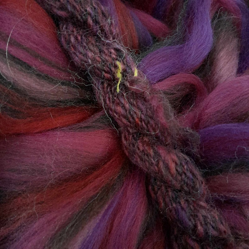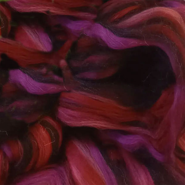 Fabulous berry colours of Merino combined with Black Welsh wool for a blend that reminds me of berries in the various stages of ripeness and berry stains on my hands when picking! Perfect for spinning and felt making. (66%/34%)