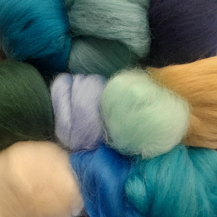 Sea and sand colours gathered together for you to create your own seascape, real or imagined! Each pack contains approx 50g each of Pale Blue, Navy, Peacock, Sand, Forest Green, Turquoise, Sea Green, Seafoam, Cornflower and Natural Merino.