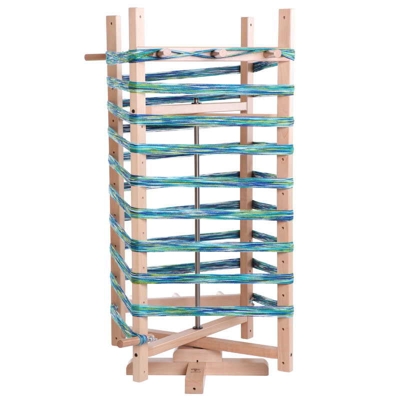 This rotating mill is for quick and easy warping with the strain taken by the strong uprights and not the pegs. The bars holding the cross pegs are moveable, so any length can be wound up to approximately 15m (50ft).