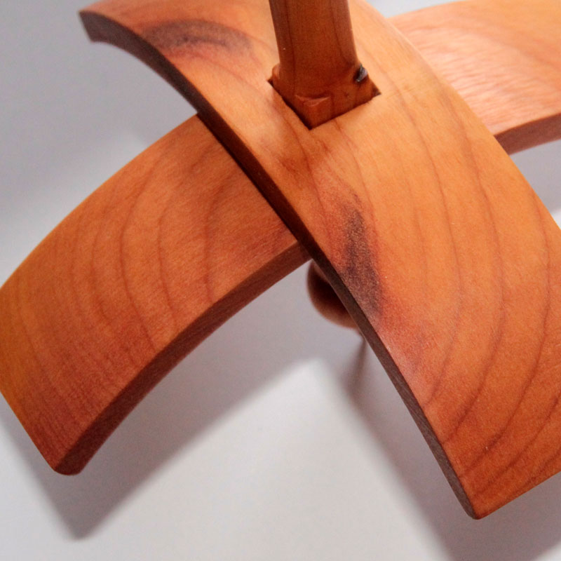 This is a hand turned turkish spindle (also known as a cross arm spindle) made in Ilkley by Simon. This spindle has square holes in the arms instead of the more conventional round holes, which prevents the arms spinning without turning the shaft. When spinning is completed the arms are removed giving a ball of yarn. It is finished with oil.