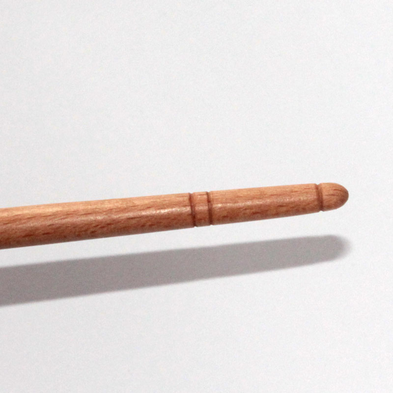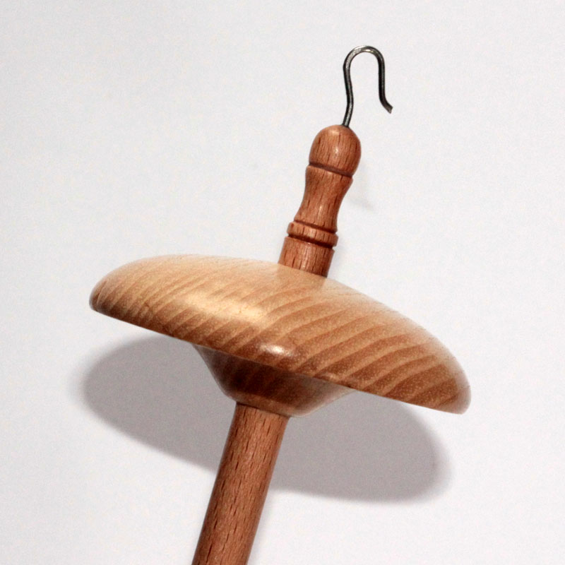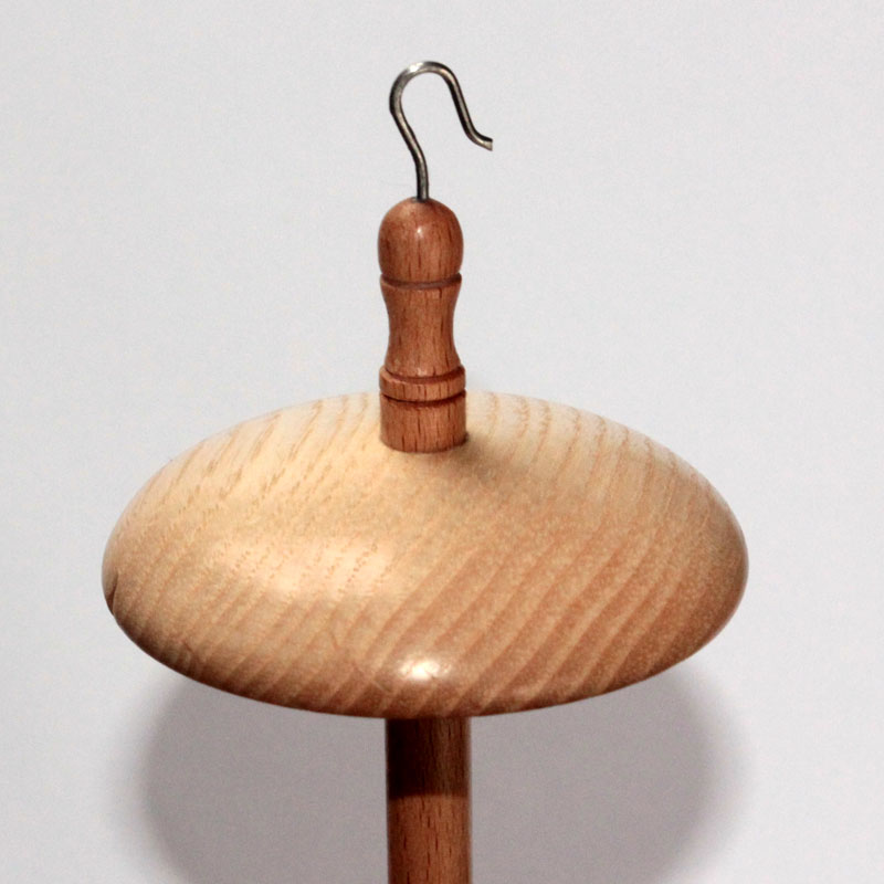 This is a hand turned top whorl drop spindle made in Ilkley by Simon. It has a groove in the side for the yarn to sit in which helps to prevent slippage. This spindle is finished with wax.
