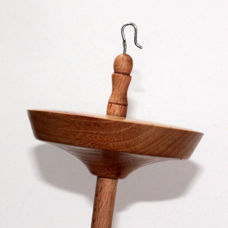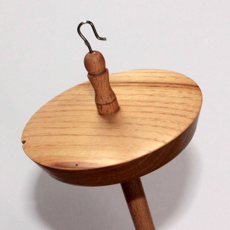 This is a hand turned top whorl drop spindle made in Ilkley by Simon. It has a groove in the side for the yarn to sit in which helps to prevent slippage. This spindle is finished with wax.